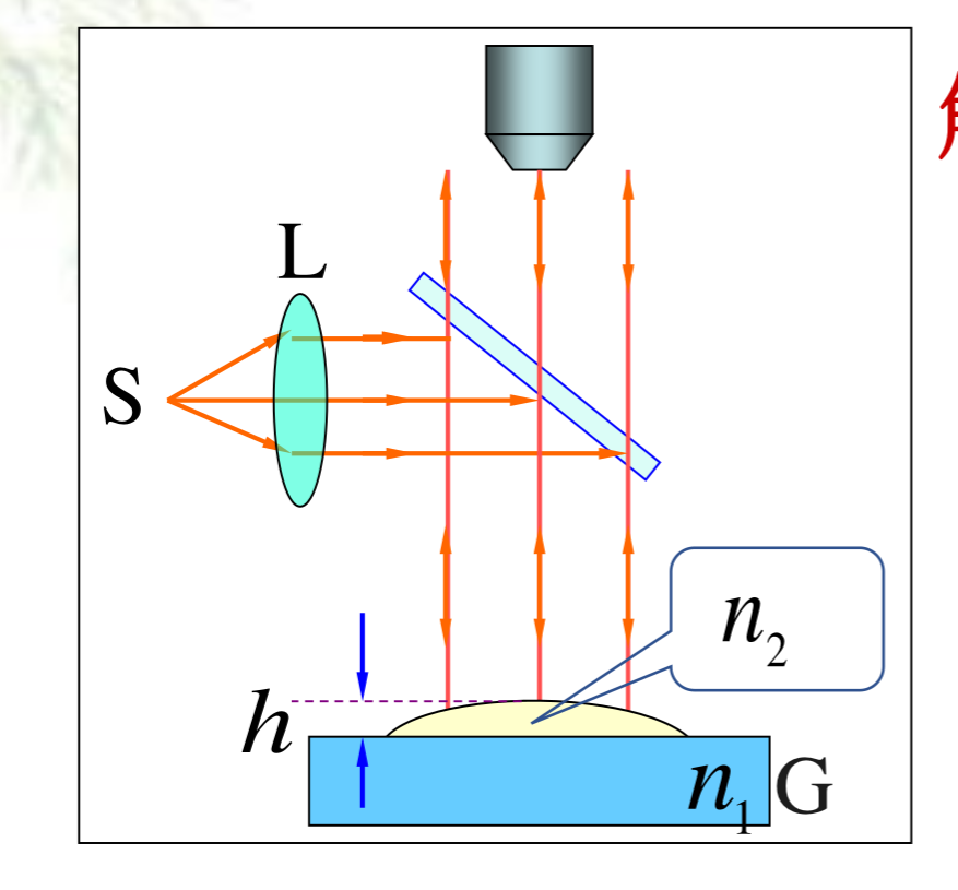 例 2 如图所示为测量油膜折射率的实验装置,在平面玻璃片G上放一油滴,并展开成圆形油膜,在波长 600 nm 的单色光垂直入射下,从反射光中可观察到油膜所形成的干涉条纹.已知玻璃的折射率为 n1 = 1.50 ,油膜的折射率 n2 = 1.20 ,问:当油膜中心最高点与玻璃片的上表面相距 h = 8.0 *10 ^2 nm 时,干涉条纹是如何分布的?可看到几条明纹?明纹所在处的油膜厚度为多少?