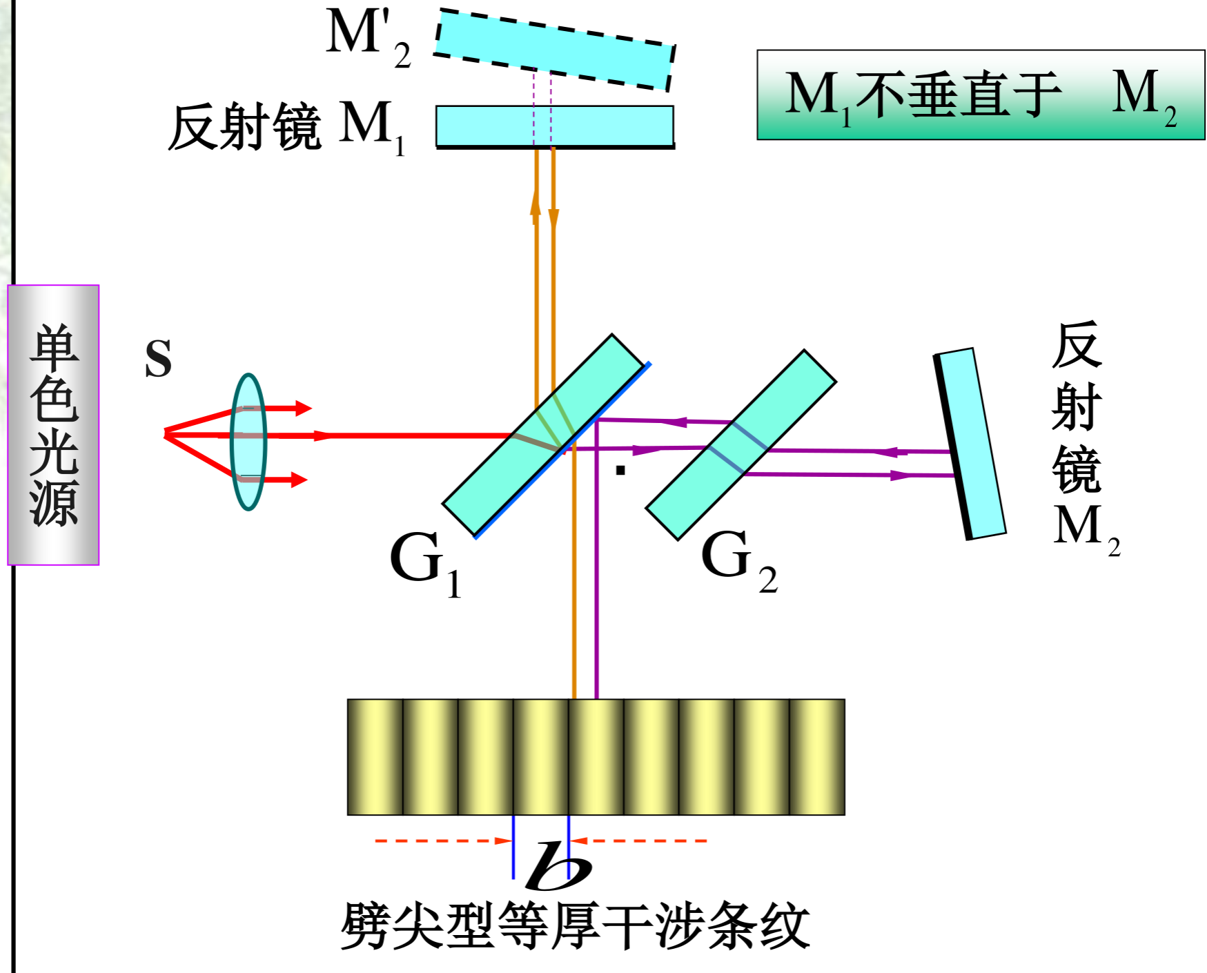 当 M1不垂直于M2时,可形成劈尖型等厚干涉条纹。