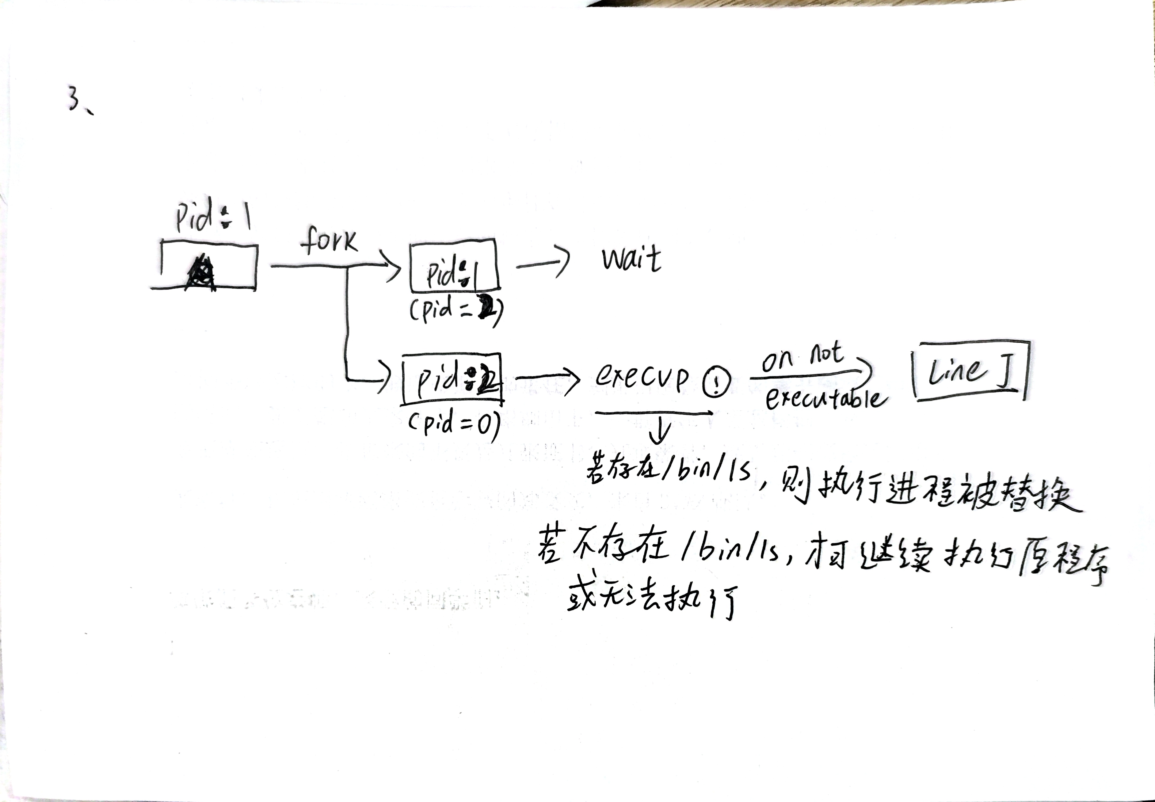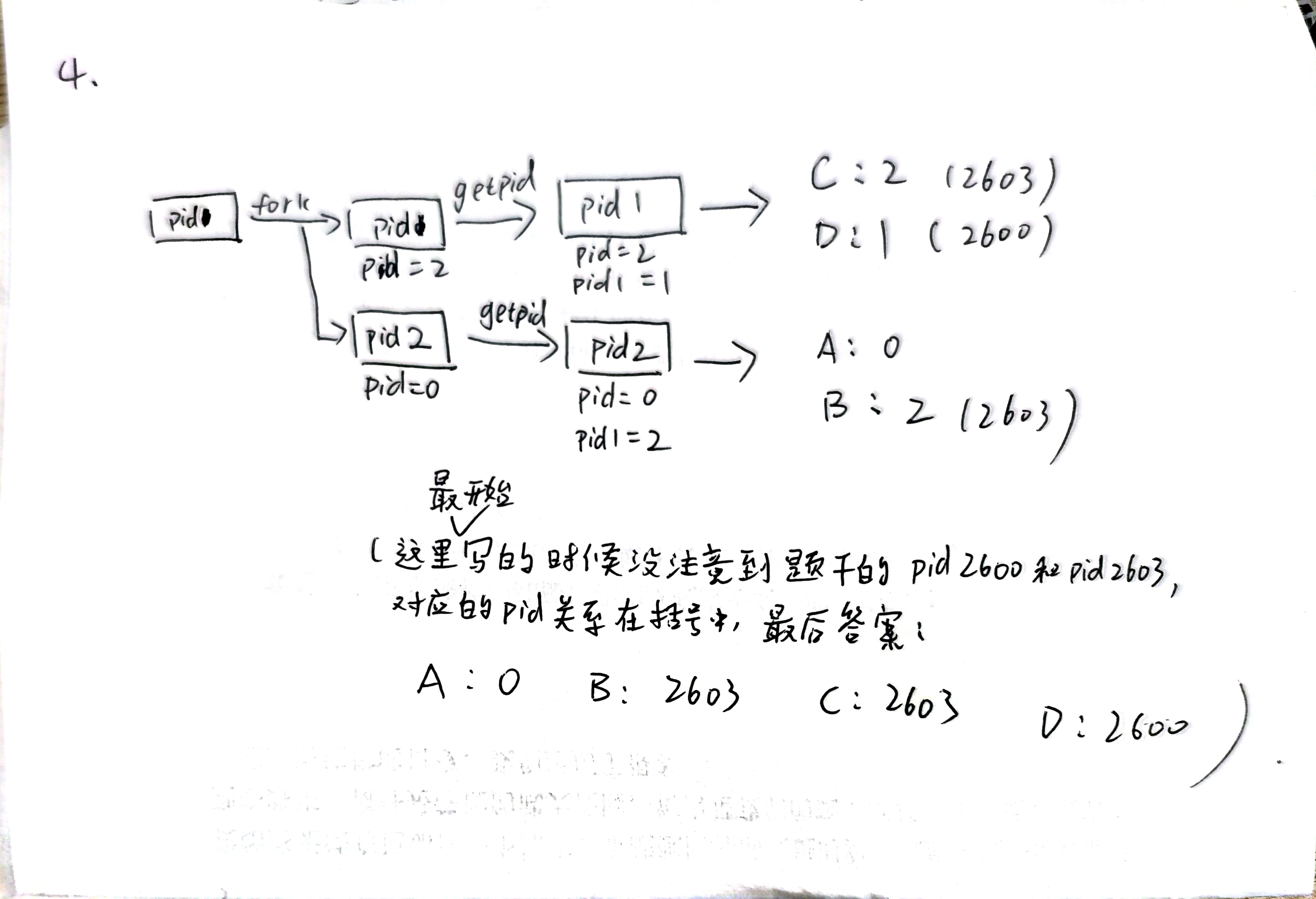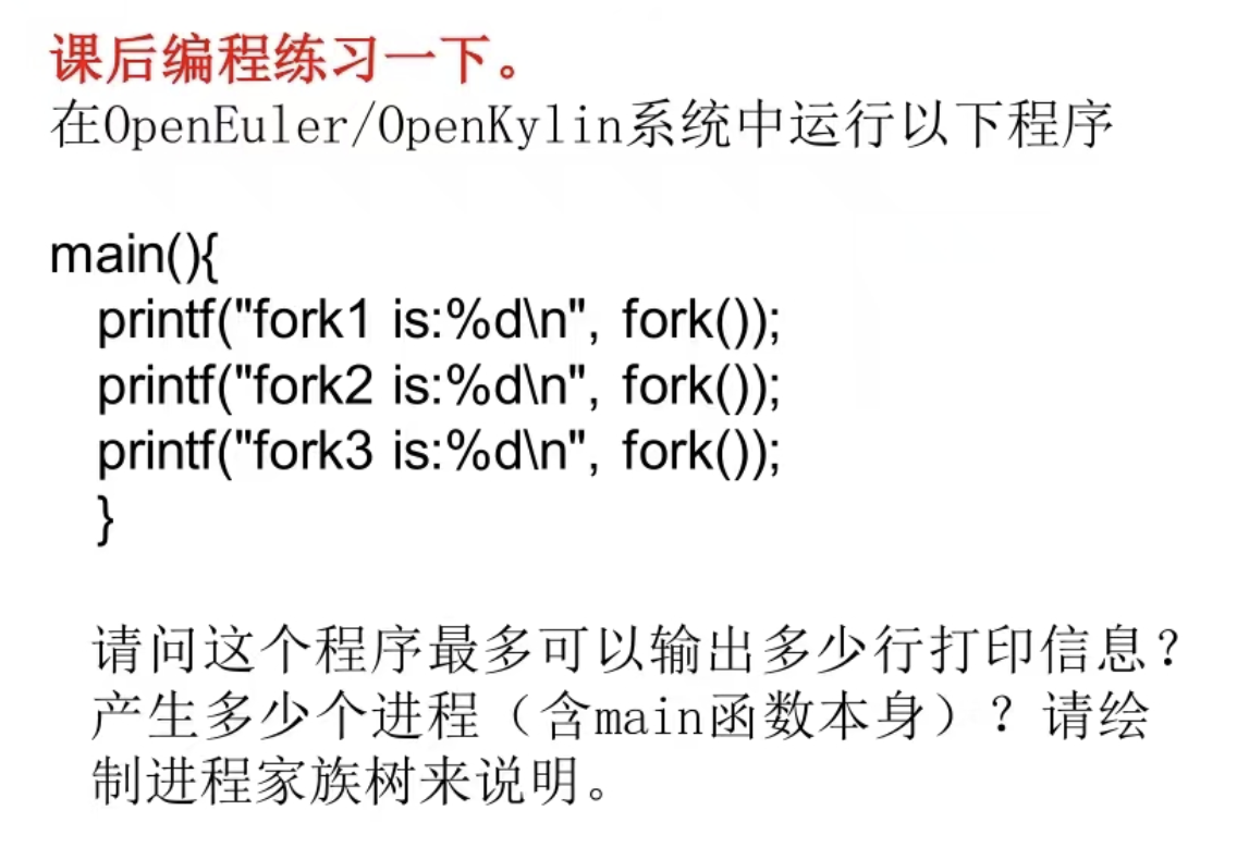 ② 对于练习中的三行打印,如果把打印改成“%d,%d,%d\n”,getpid(),fork(),getpid()函数,结果会怎样?为什么?