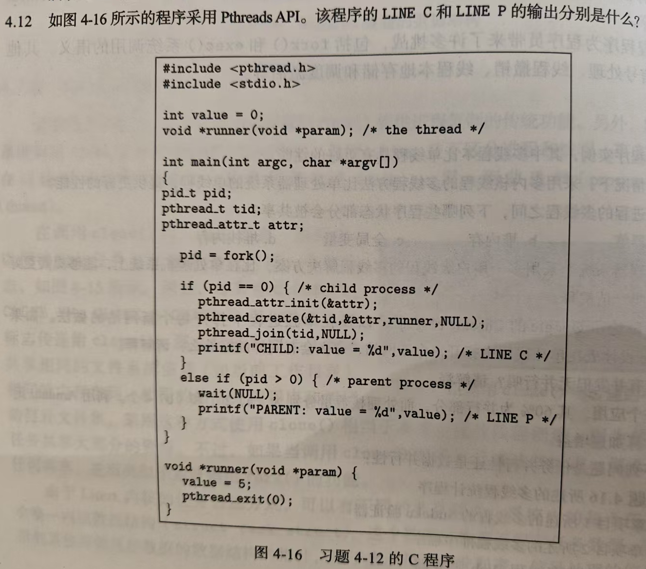 LINE C的输出是5。此时新的线程会对该进程中的value进行修改,同时因为执行了join所以也不用考虑条件竞争的问题。